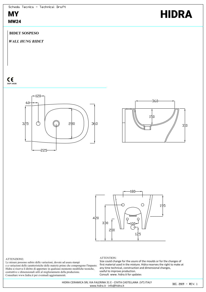 Bidet sospeso in ceramica colore bianco cm 52x36. Rubinetteria e accessori esclusi. Kit di fissaggio incluso.