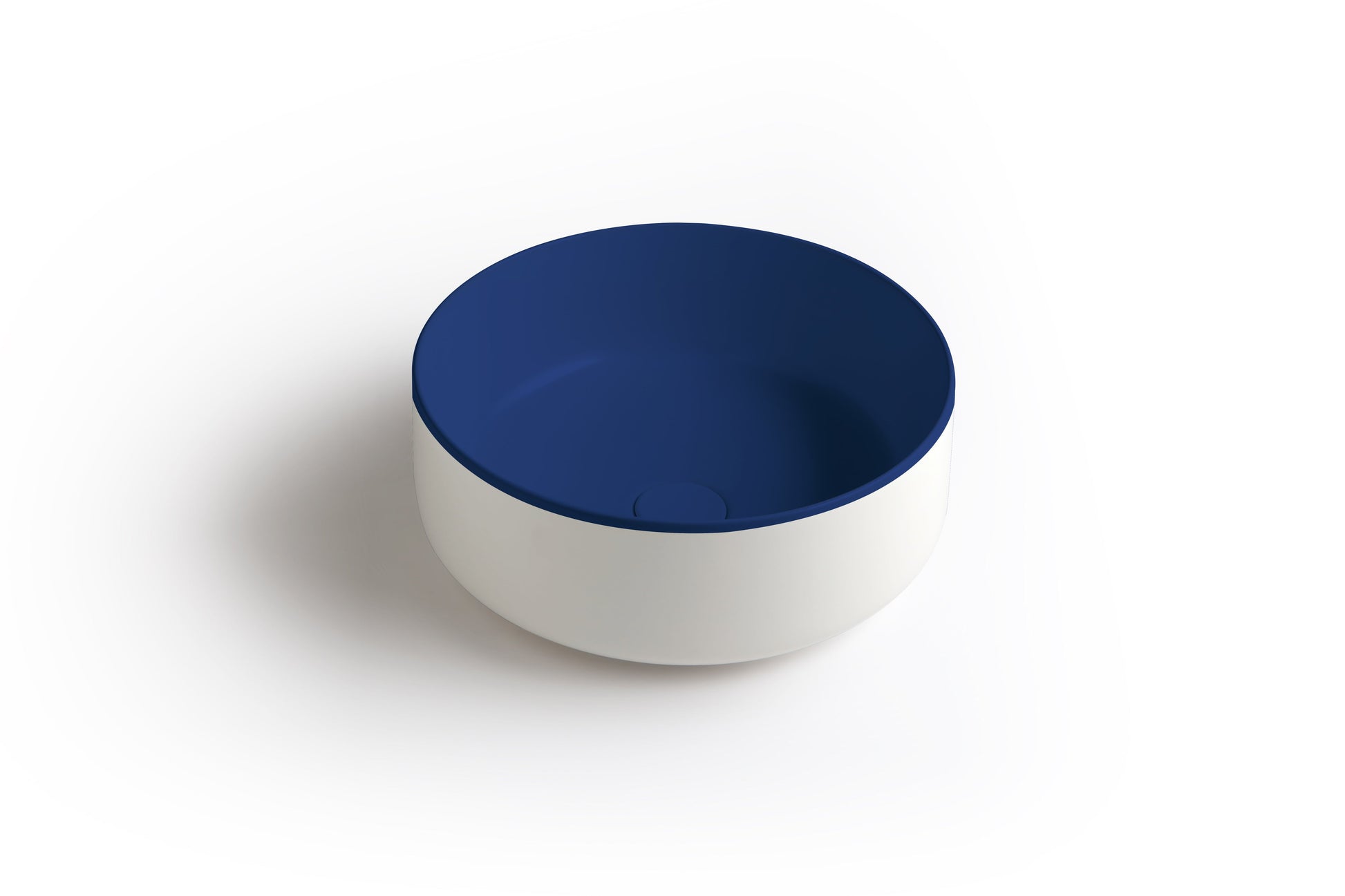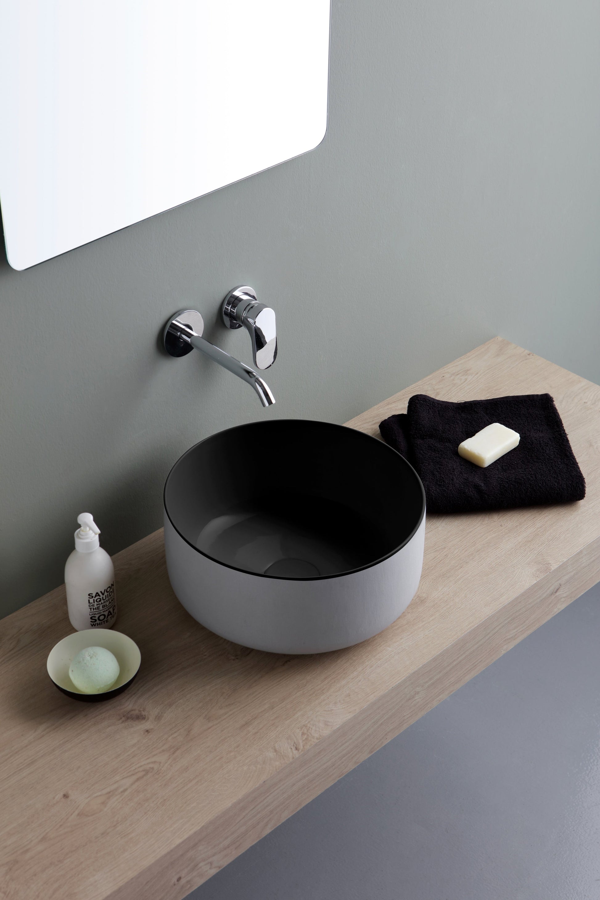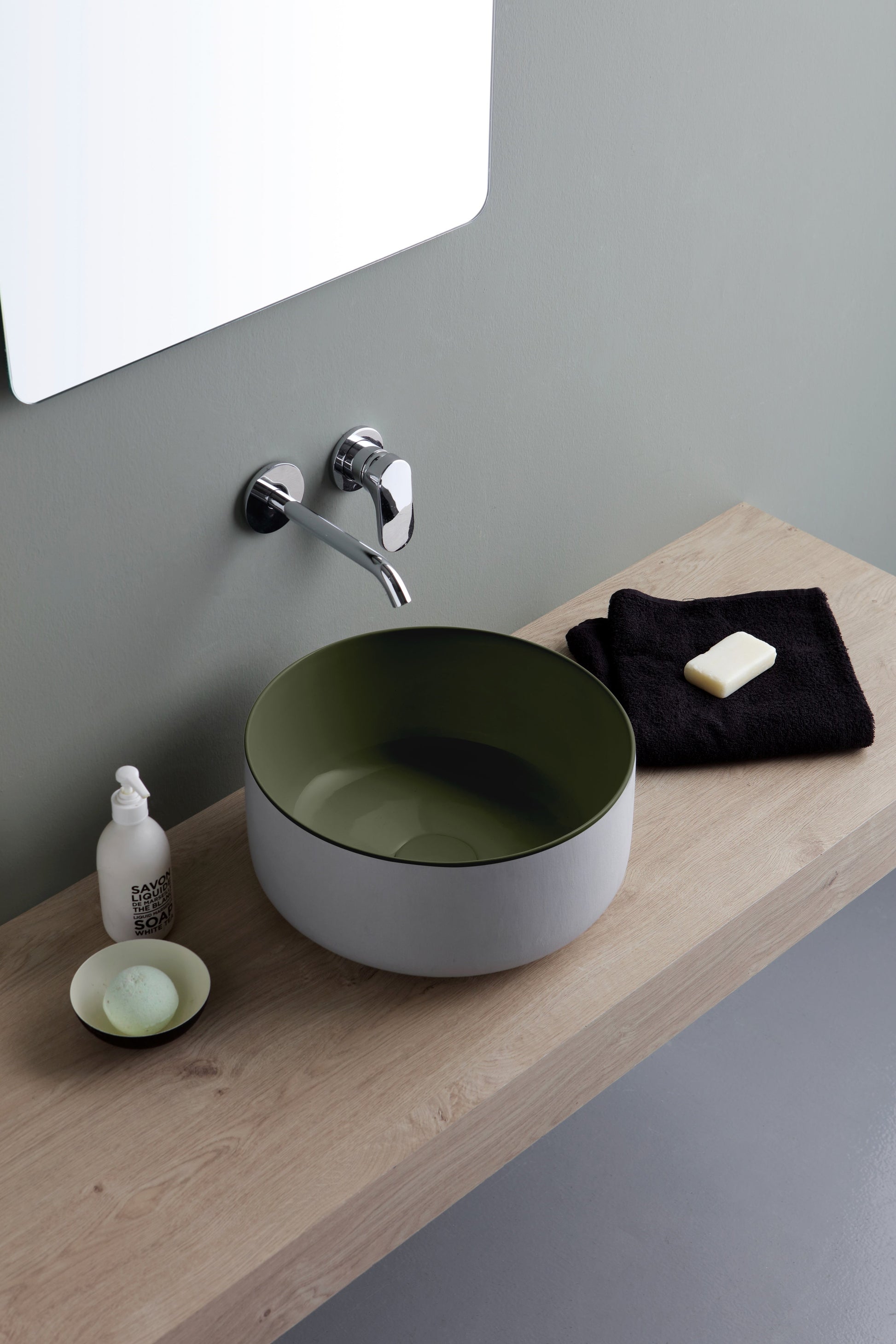 Lavabo d’appoggio in ceramica, con esterno in ecomalta effetto cemento, vasca in ceramica in vari colori.