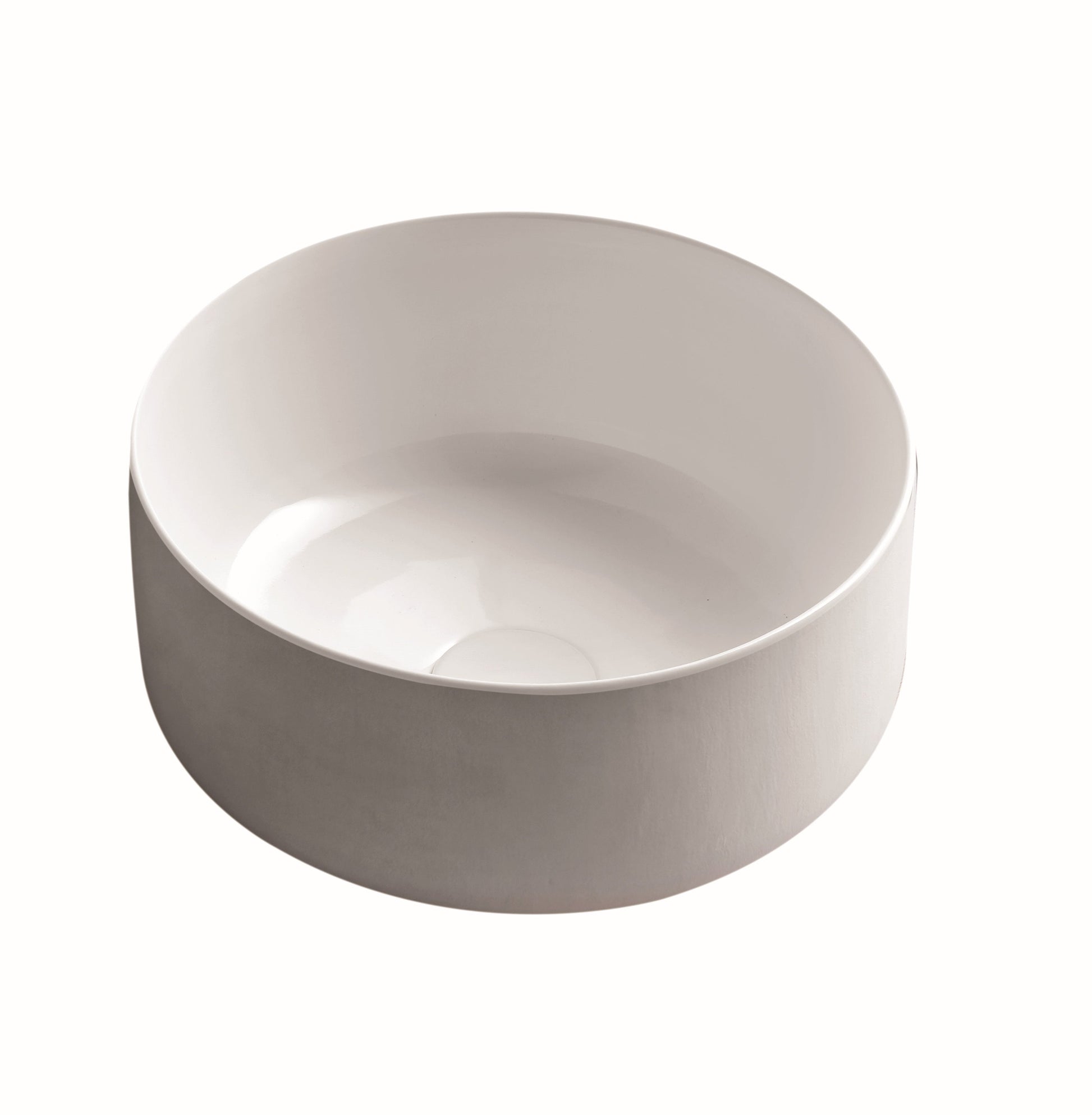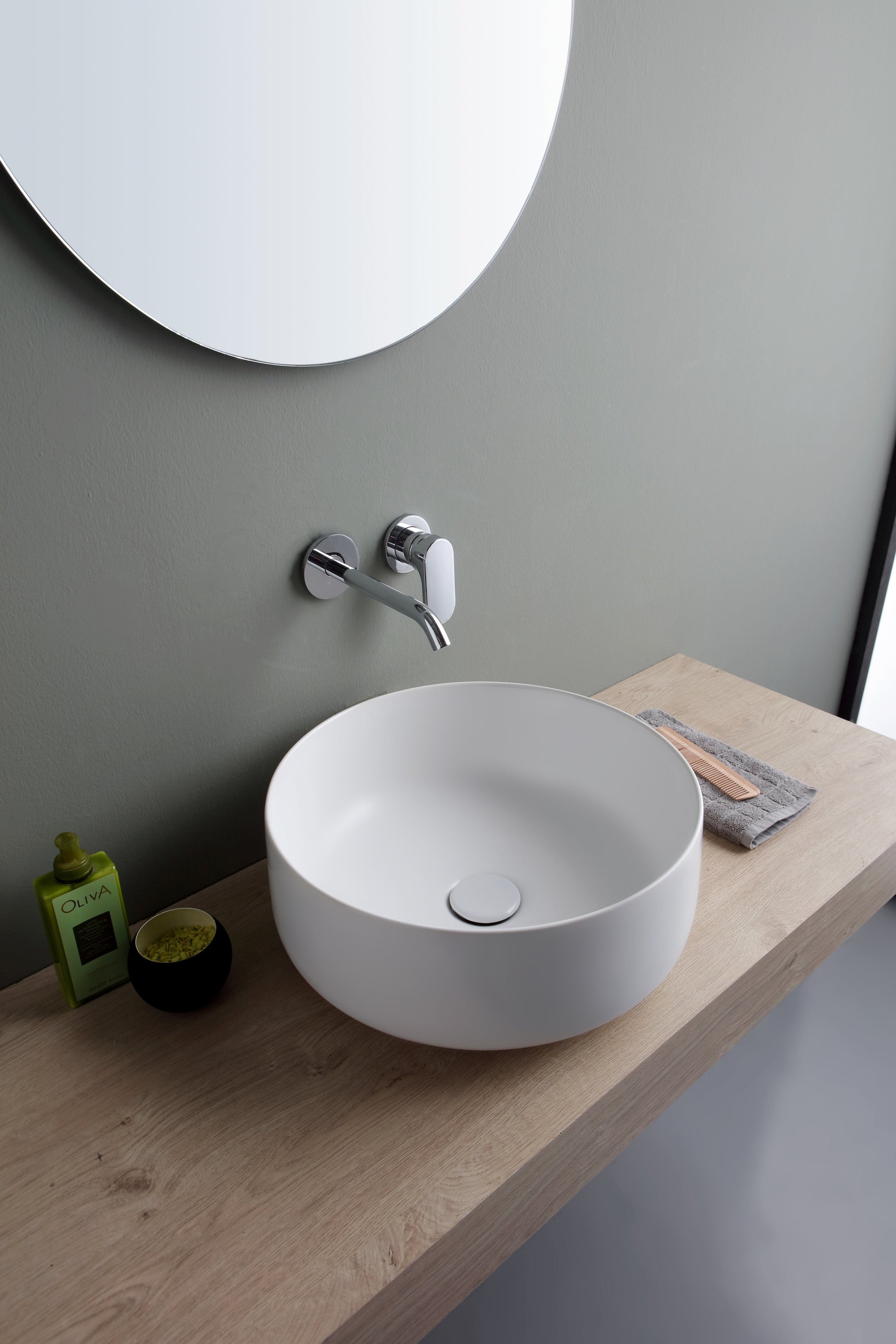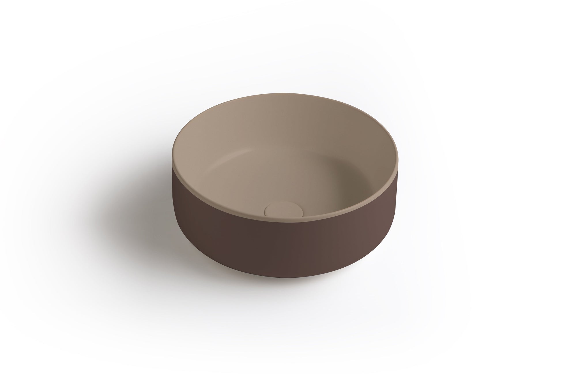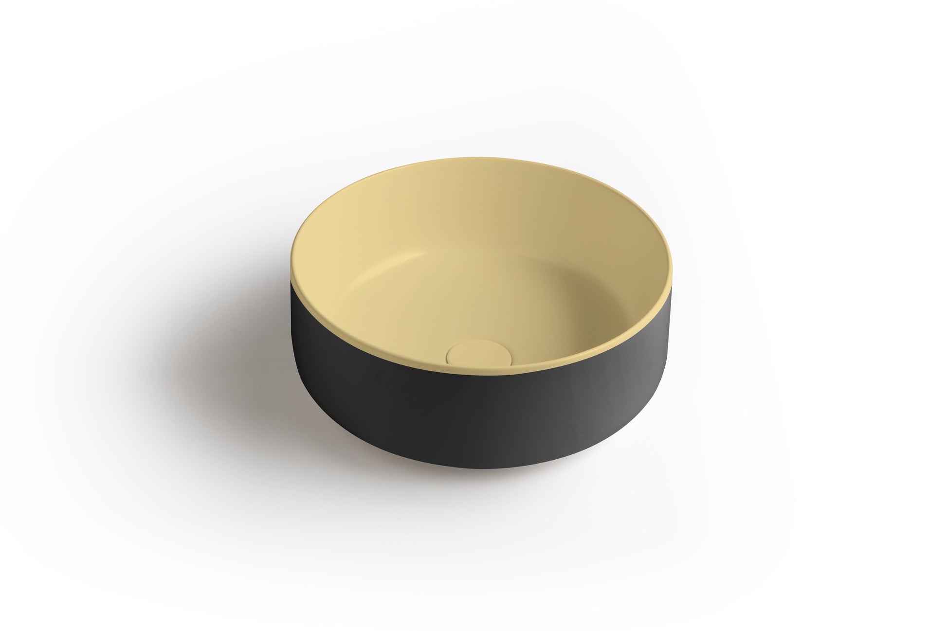 Lavabo d’appoggio in ceramica, con esterno in ecomalta effetto cemento, vasca in ceramica in vari colori.