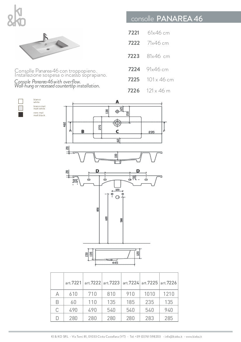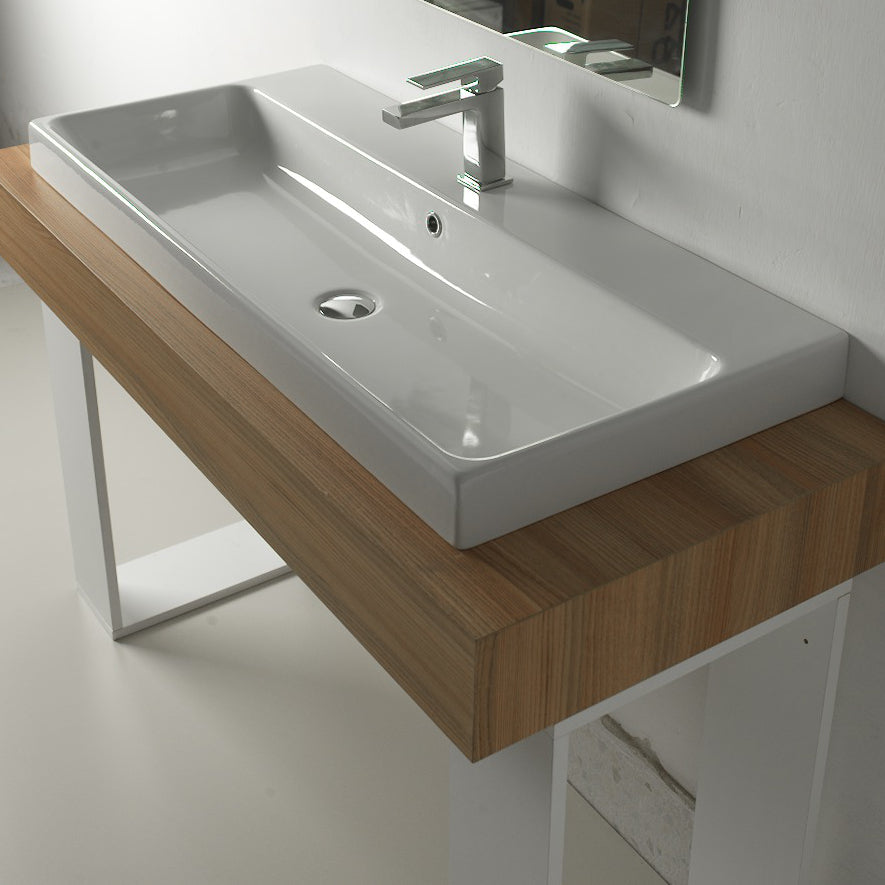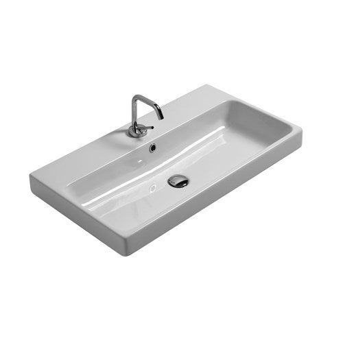 Lavabo di tipo consolle, in ceramica bianco, con installazione sospesa o da incasso soprapiano. Con foro rubinetteria e troppo pieno. Accessori esclusi.