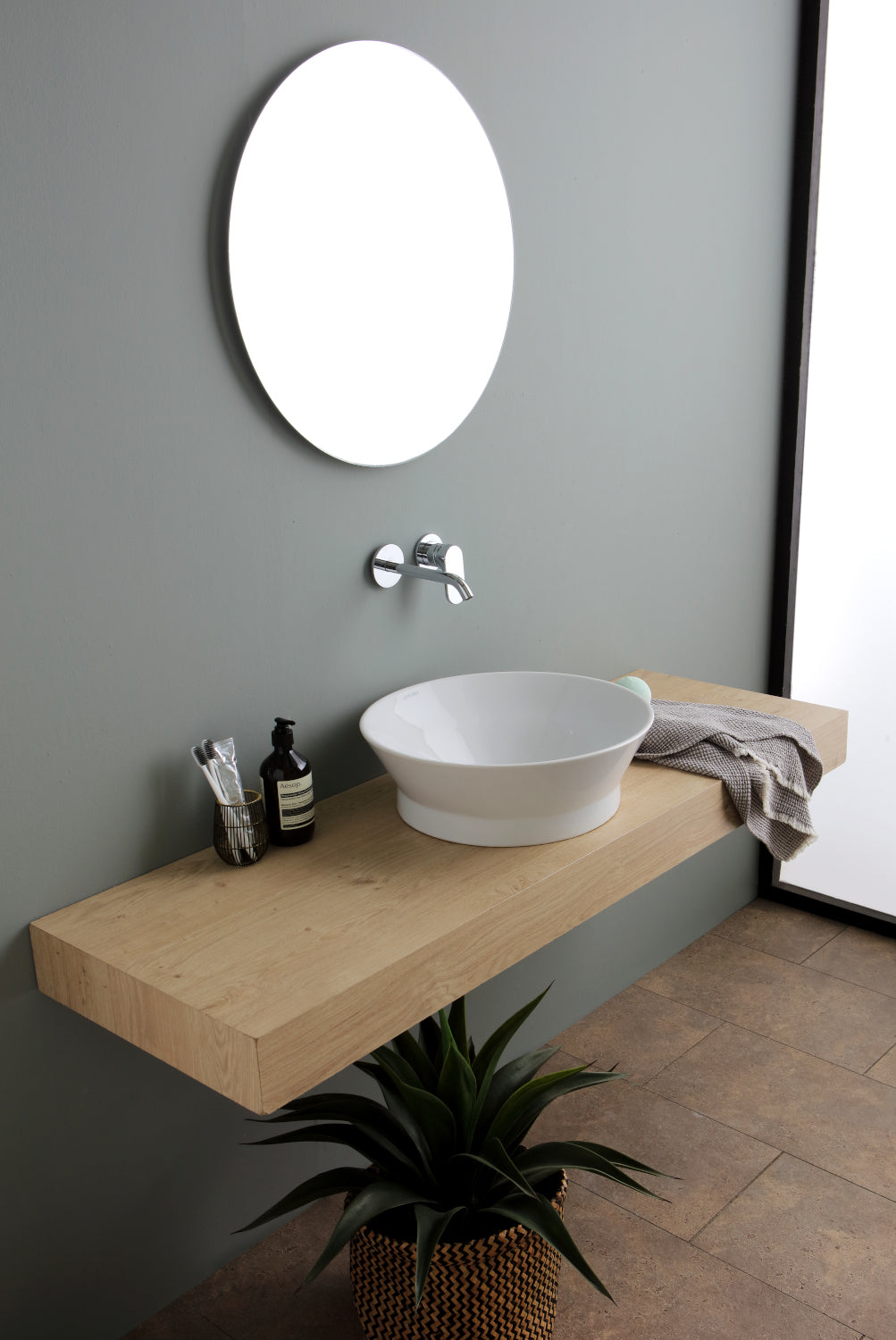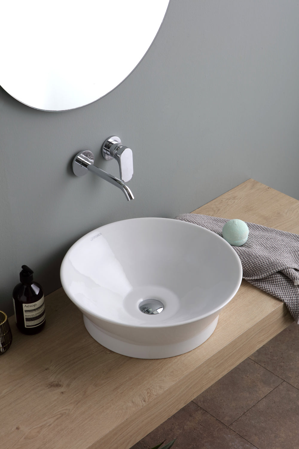 Lavabo d'appoggio, diametro esterno cm 45 x altezza cm 15. Piletta clip e clap e copripiletta in ceramica esclusi. Strutture e accessori esclusi.
