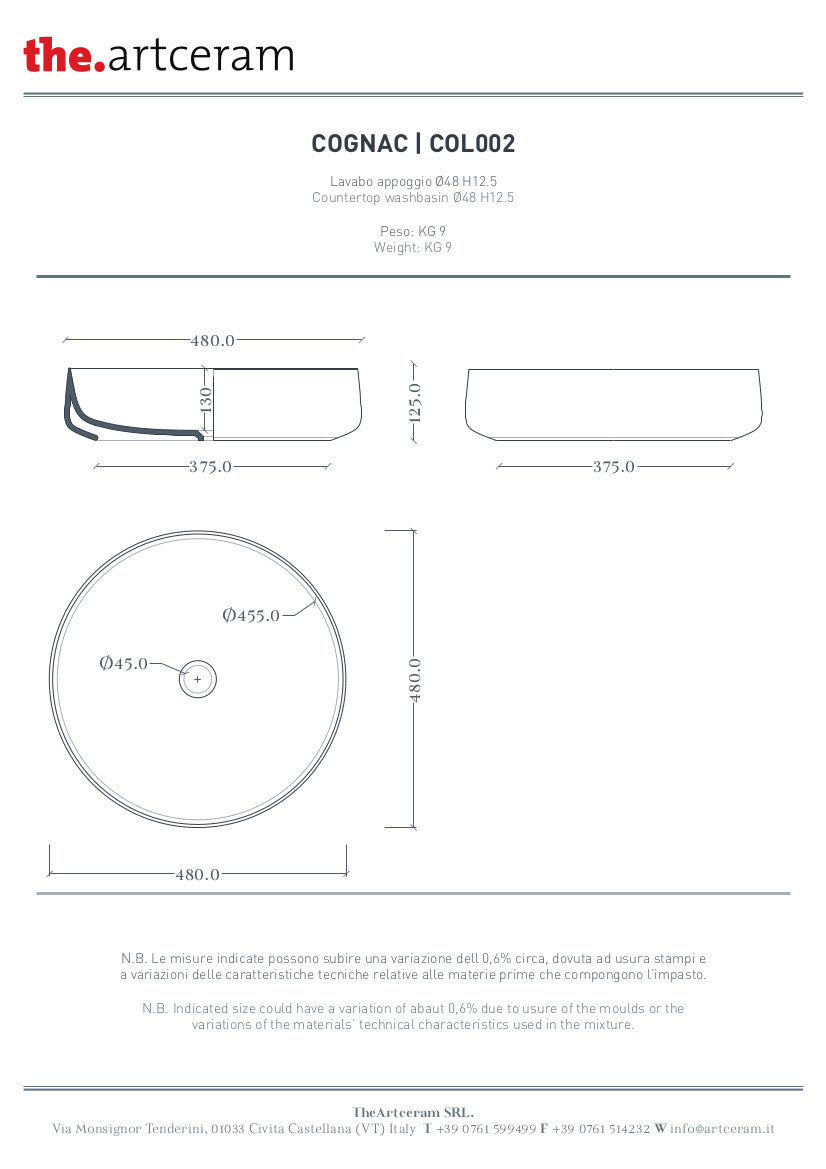 Lavabo da appoggio in ceramica della collezione COGNAC con dimensioni Ø48, nelle finiture marmoree. Piletta in ceramica up&down inclusa nel prezzo