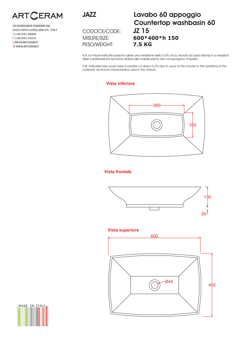 Lavabo da appoggio in ceramica, senza foro rubinetto né troppo pieno, cm 60x40. Piletta esclusa