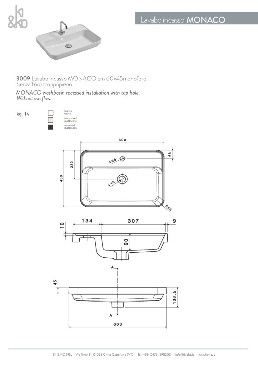 Lavabo in ceramica con foro per rubinetto e senza troppopieno. Accessori esclusi.