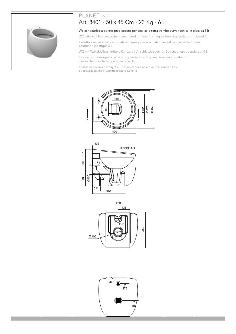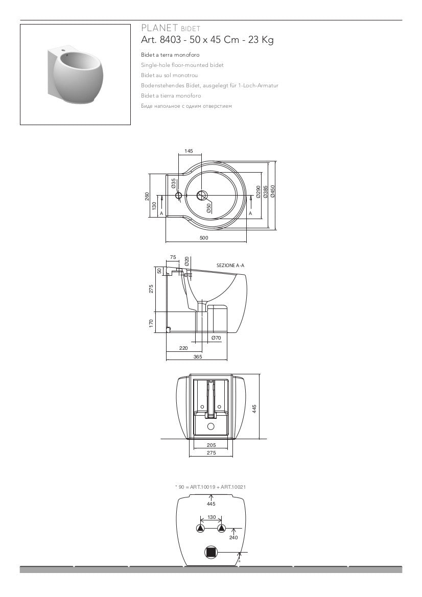 I sanitari a terra Planet presentano una struttura avvolgente dalle linee sobrie e compatte per un arredo completo. Sono realizzati in ceramica bianca; il vaso a terra Planet ha uno scarico a parete fissato a pavimento tramite curva tecnica in plastica da 6 litri, mentre il bidet a terra Planet ha rubinetteria monoforo.