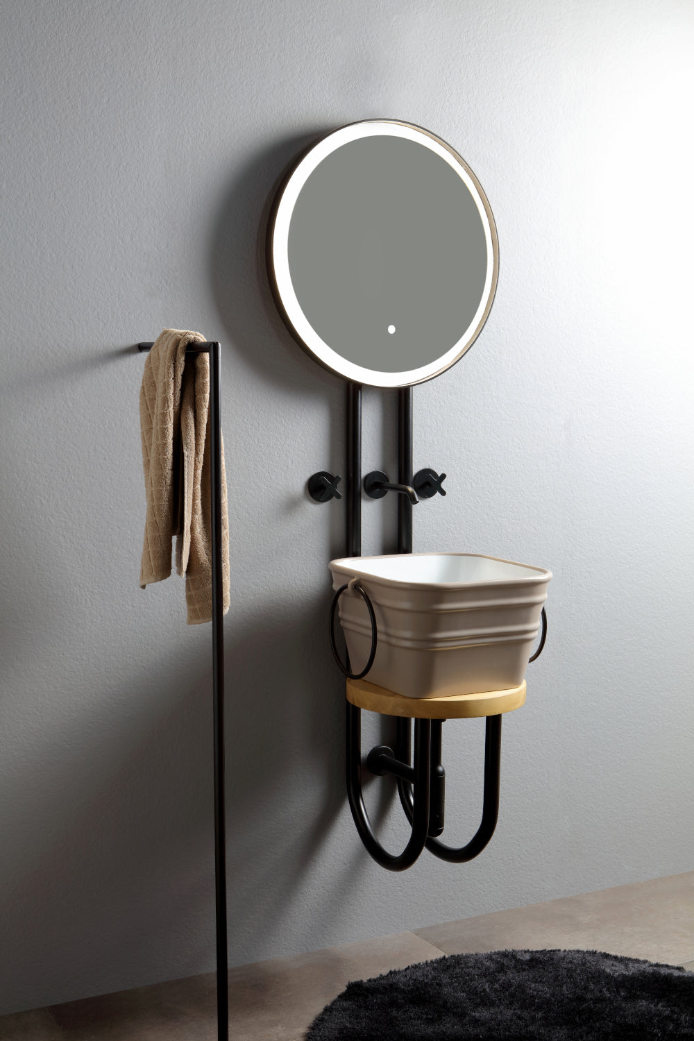 Struttura in metallo sospesa con specchio retroilluminato a Led e ripiano in marmo, per lavabi Bacile Cubo e Bacile Midi. Disponibile in due colori.