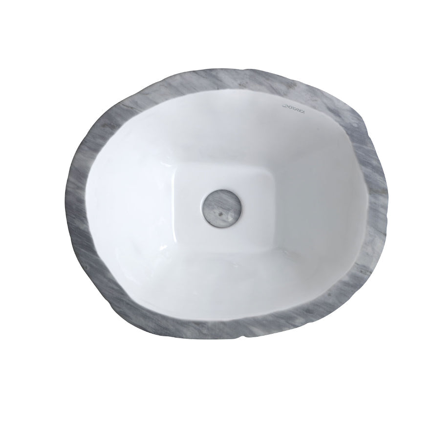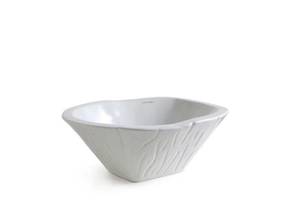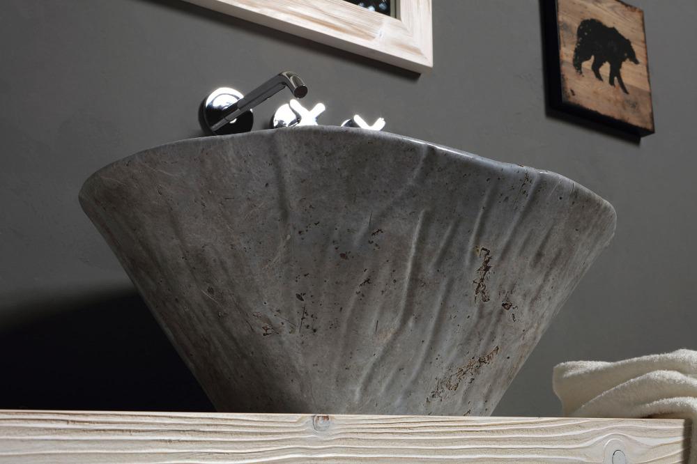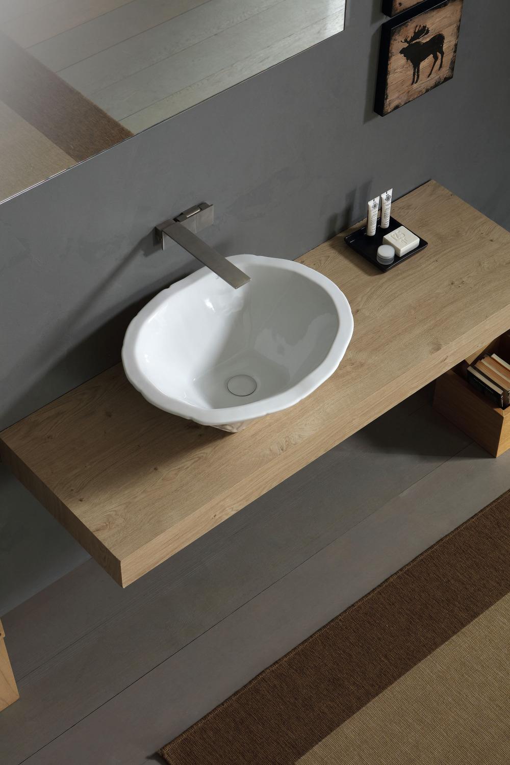 Lavabo d’appoggio o sospeso in ceramica con speciali decorazioni per conferire l'effetto delle pietre naturali.