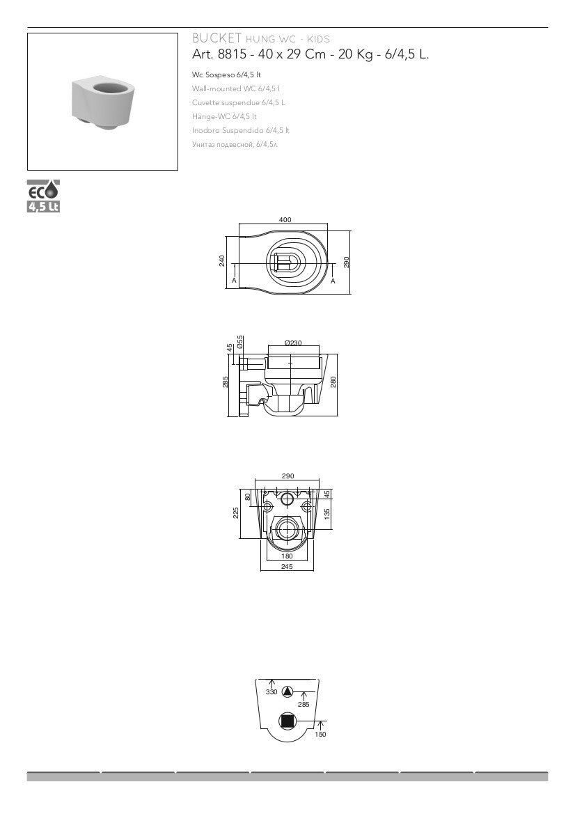 Realizzati in ceramica bianca, sono sospesi e si installano tramite le staffe di fissaggio; il vaso ha il lato a parete non smaltato.
