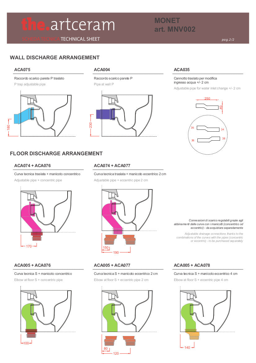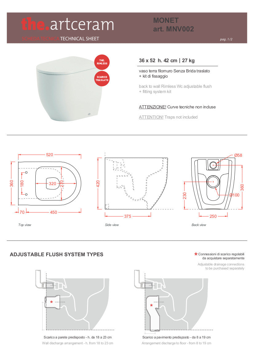 Vaso terra filomuro senza brida traslato + kit di fi ssaggio. Curve tecniche, coprivaso e bidet non inclusi, acquistabili a parte