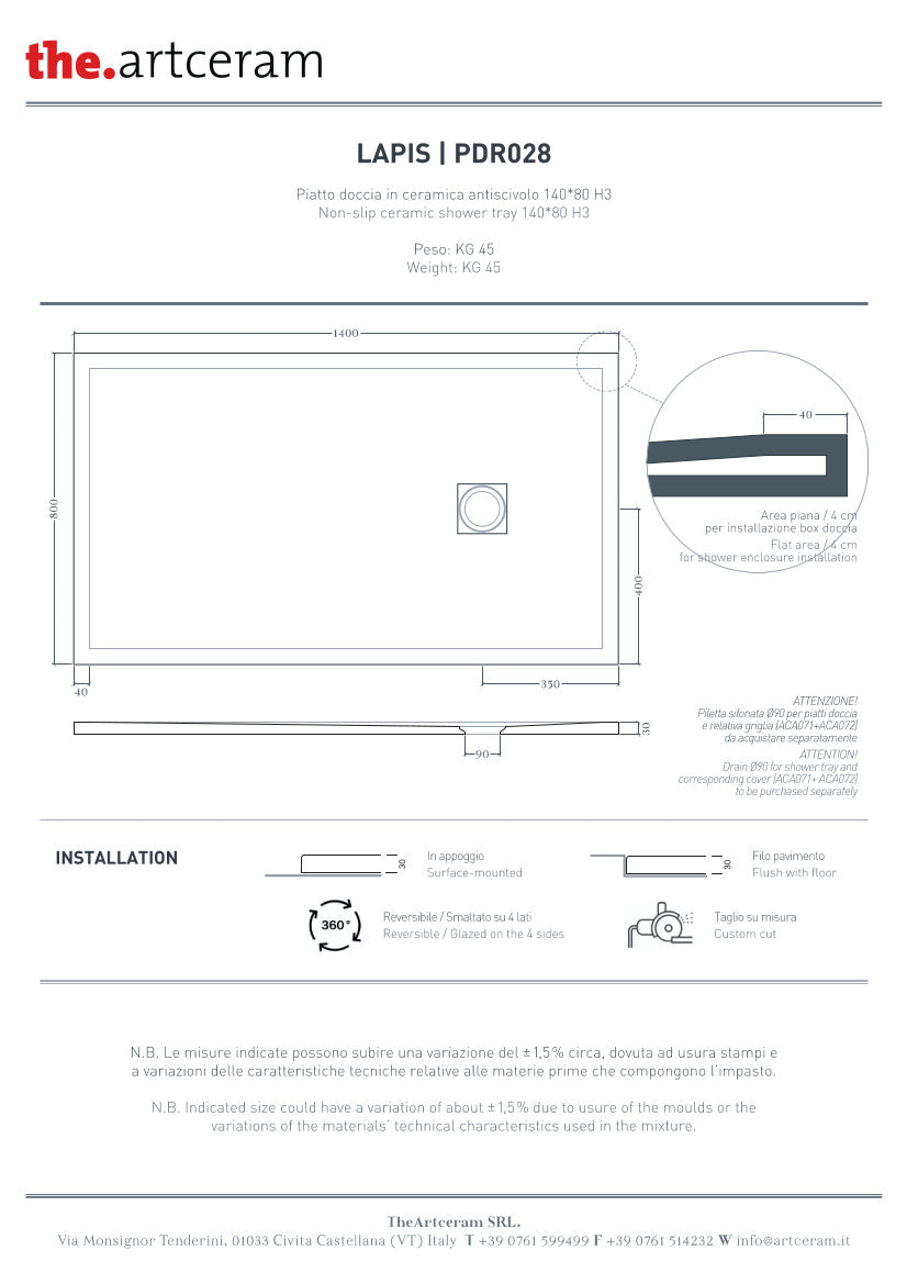 Piatto doccia 140x80 H3 Lapis
